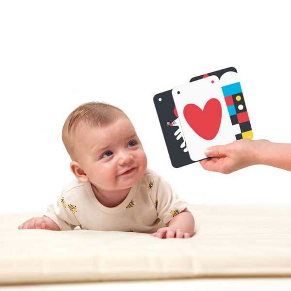 O conjunto funciona como um pequeno livro preso por um cordão, permitindo folhear facilmente as imagens enquanto os pais mostram as cartas ao bebé. Olhar para as figuras, falar sobre o que aparece nas imagens e explorar os padrões é uma excelente forma de estimular a curiosidade, a atenção e o vínculo entre pais e bebé.
