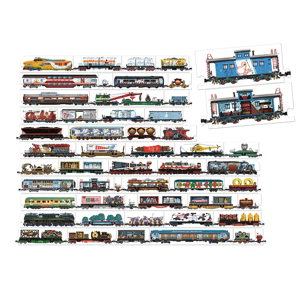 Conteúdo: 54 peças de puzzle de dupla face 1 póster educativo com curiosidades sobre comboios Embalagem resistente com pega (ótimo para oferecer)