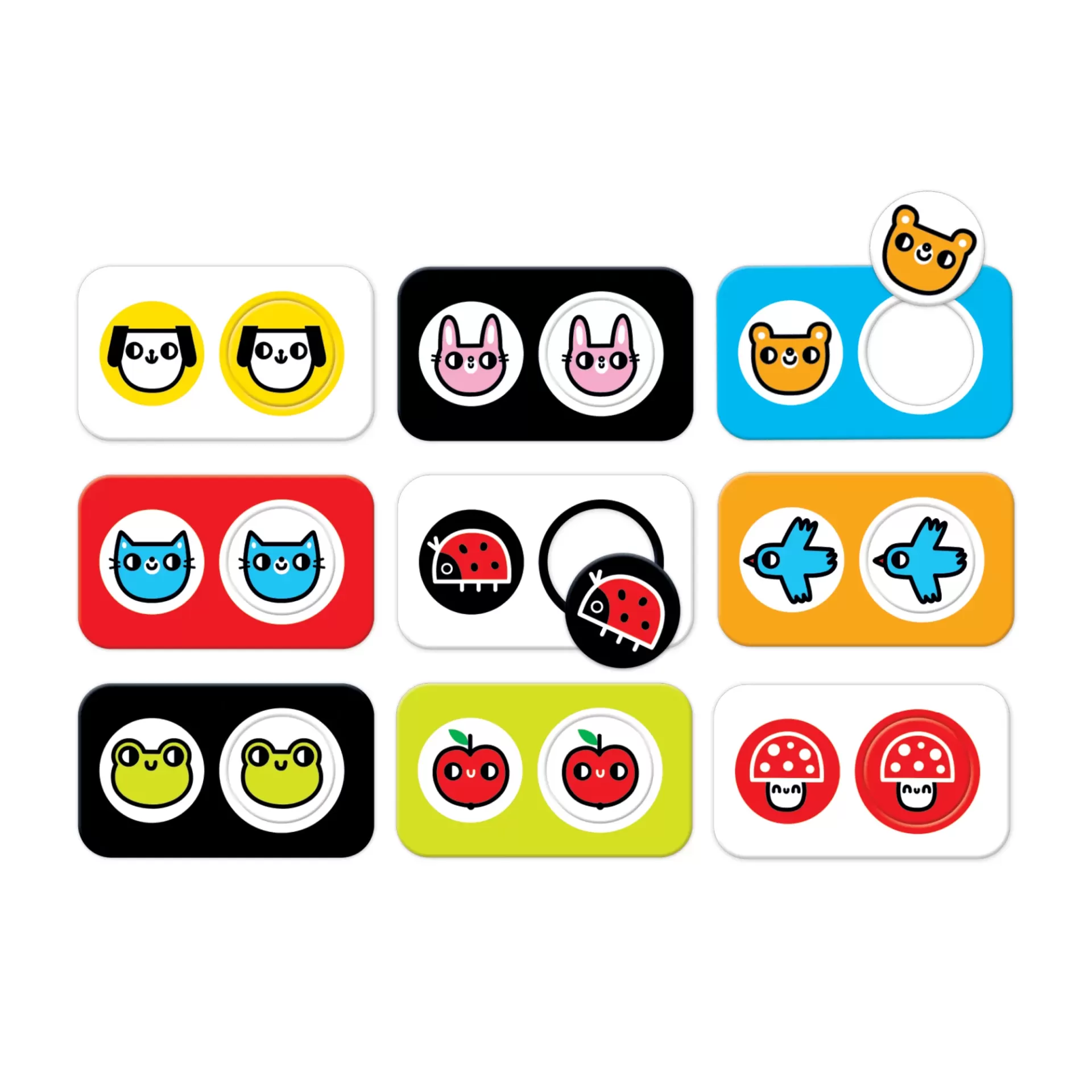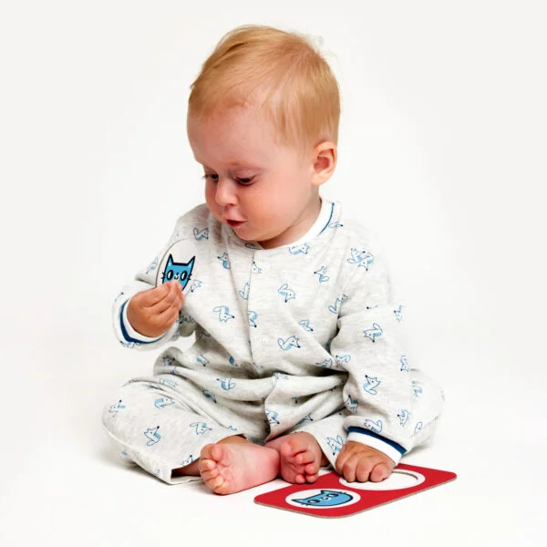 Este conjunto contém 9 puzzles de 2 peças, onde os pequenos são convidados a emparelhar animais, frutas e objetos conhecidos do seu dia-a-dia. Cada par tem um design alegre e cores fortes, ideais para captar a atenção e desenvolver a percepção visual, concentração e coordenação óculo-manual.