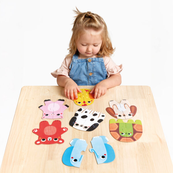As peças são resistentes e adaptadas a mãos pequenas, permitindo que os bebés manipulem facilmente os puzzles enquanto descobrem diferentes animais como o elefante, o cão, a tartaruga ou o passarinho.