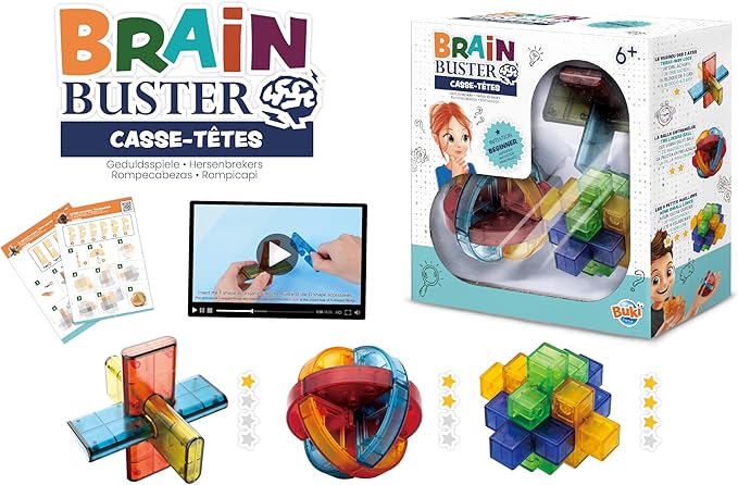 Brain Buster da Buki é o conjunto ideal para pequenos génios que adoram desafios! Pensado para crianças a partir dos 6 anos, este jogo educativo inclui 3 quebra-cabeças translúcidos em cores vibrantes que desafiam a lógica e a paciência: