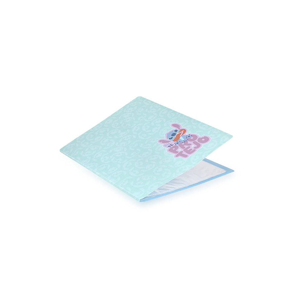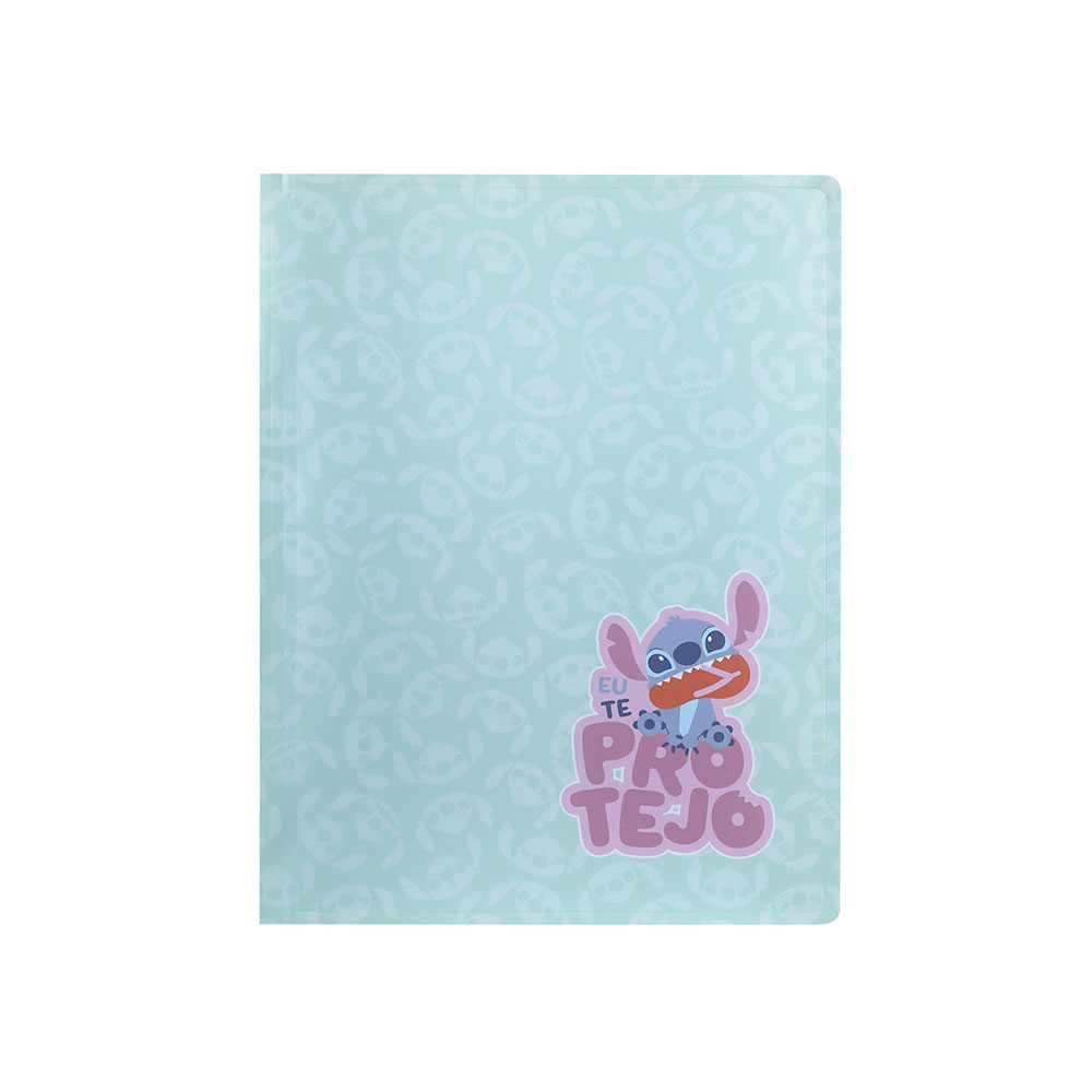 Na parte frontal, o adesivo “Eu te protejo” com o Stitch segurando um pãozinho — referência ao lema “Love more” — traz um toque divertido e motivacional. Com dimensões externas de 31 x 23 x 0,5 cm, a capa acomoda folhas A4 (até 22,5 cm de largura interna), sejam trabalhos impressos, capas de fichário avulsas ou desenhos feitos em papel solto. É ideal para estudantes do 1.º ao 3.º ciclo que precisam manter seus materiais organizados e protegidos.