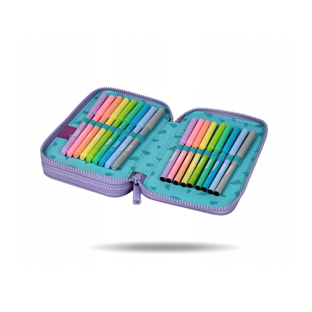 O forro interno colorido, com padrão de folhas, facilita a visualização e a organização dos itens. Fabricado em poliéster resistente, o estojo é fácil de limpar—uma simples passada de pano úmido resolve a maior parte das sujeiras. As costuras reforçadas e zíperes duplos garantem longa durabilidade, mesmo sob o uso diário intenso de alunos de 1.º ciclo (6 a 9 anos).