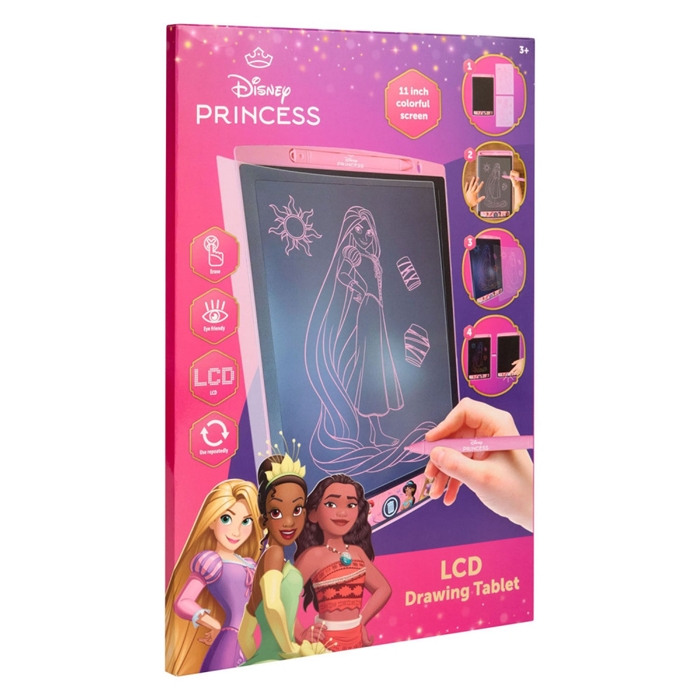 Com o Tablet de Desenho LCD das Princesas Disney, os mais pequenos podem desenhar, apagar e recomeçar quantas vezes quiserem! Ideal para crianças a partir dos 3 anos, este tablet de 11 polegadas vem com personagens como Rapunzel, Moana, Ariel e outras princesas que tanto adoram.