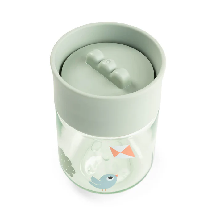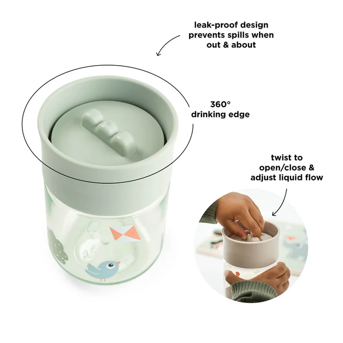 Com um design inteligente e sistema anti-fugas, permite beber em qualquer ponto do rebordo (360º), simulando a experiência de um copo normal — mas com muito mais segurança. Ideal para a transição do biberão para o copo tradicional.