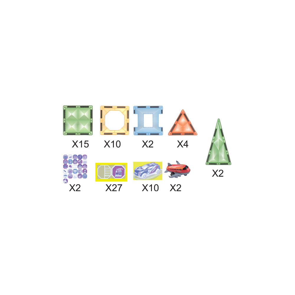 Cognitiva – Ajuda no reconhecimento de formas e veículos do mundo real. Motora – Estimula a destreza manual através da construção livre. Sensorial – Através das peças coloridas e das diferentes texturas. Parental – Ideal para brincar em conjunto e fortalecer laços familiares. Este conjunto inclui blocos magnéticos transparentes em várias formas, autocolantes decorativos e mini veículos com rodas reais. Tudo o que a criança precisa para horas de diversão educativa!