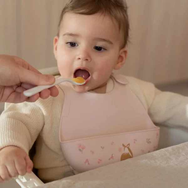 Recomendado a partir dos 6 meses Silicone 100% alimentar, livre de BPA Flexível e confortável para o bebé Bolso apanhador integrado Fecho ajustável com vários níveis Fácil de limpar: lavar com água morna e sabão ou na máquina Padrões exclusivos da Little Dutch: Forest Friends e Fairy Garden