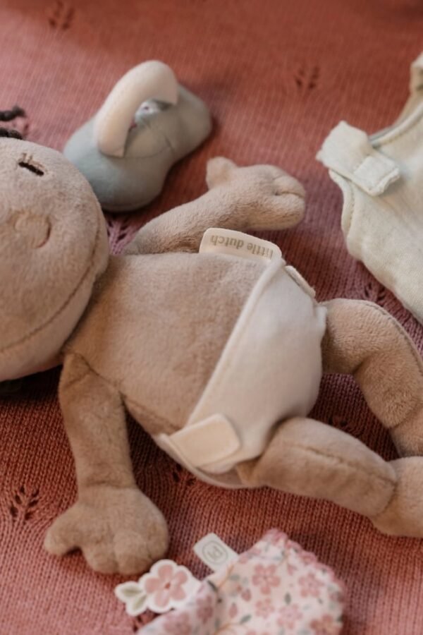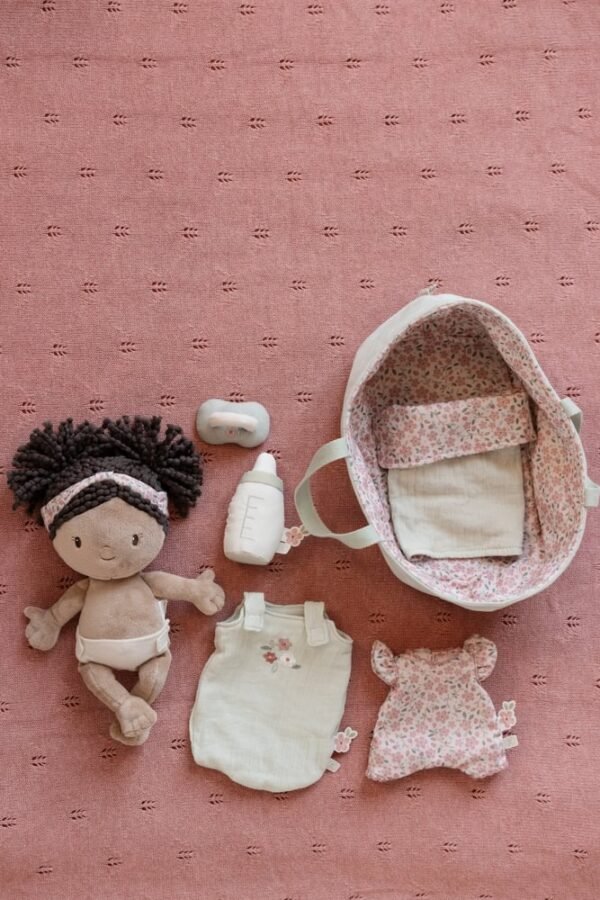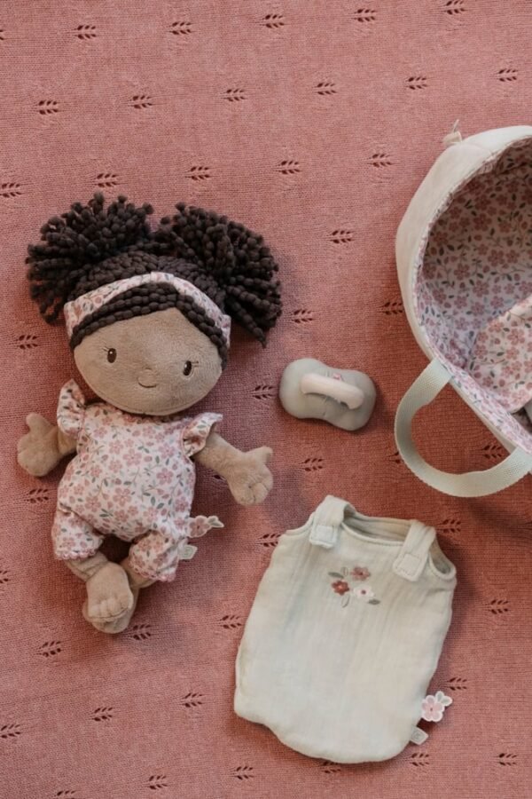 A boneca veste um delicado conjunto floral, com detalhes suaves e cores calmas que refletem o estilo doce e intemporal da Little Dutch. O seu tamanho e textura macia tornam-na fácil de abraçar e ideal para mãos pequenas.