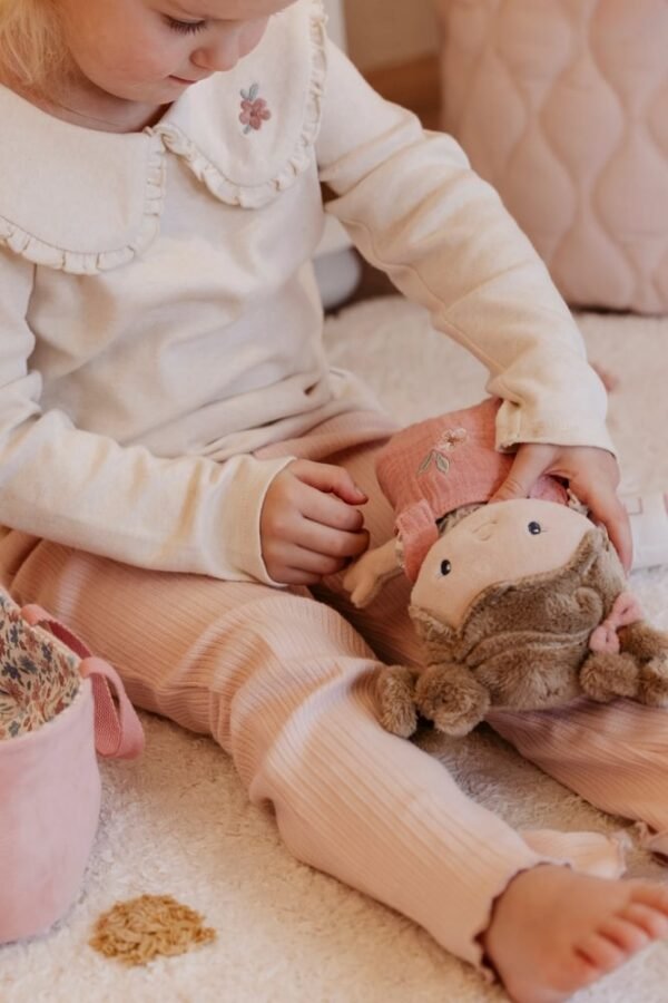 A boneca apresenta um delicado padrão floral e tons suaves, característicos do estilo doce e intemporal da Little Dutch. O seu corpo macio torna-a perfeita para abraçar e fácil de manusear por mãos pequenas.