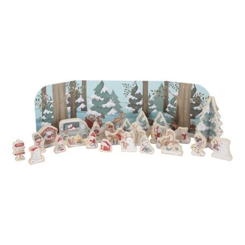 24 surpresas em madeira (casinhas, animais, decorações, etc.) Um cenário dobrável de Natal para brincar com os elementos Design encantador e ilustrações em tons suaves e natalícios Produto seguro e feito com madeira certificada FSC Ideal para criar tradições inesquecíveis em família. Perfeito para colocar na sala, quarto ou junto à árvore de Natal!