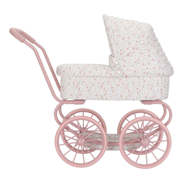 Este encantador carrinho de boneca possui um visual retrô e romântico, ideal para crianças que adoram brincar de cuidar de seus bebês de brinquedo. Com estrutura metálica pintada em um tom rosa claro fosco, o carrinho é equipado com quatro grandes rodas raiadas, proporcionando estabilidade e um visual clássico.