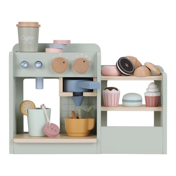 Inclui uma grande variedade de acessórios como cápsulas de café, canecas, pastelaria, colheres, pacotes de leite e açúcar, tudo com o design minimalista e natural característico da Little Dutch.