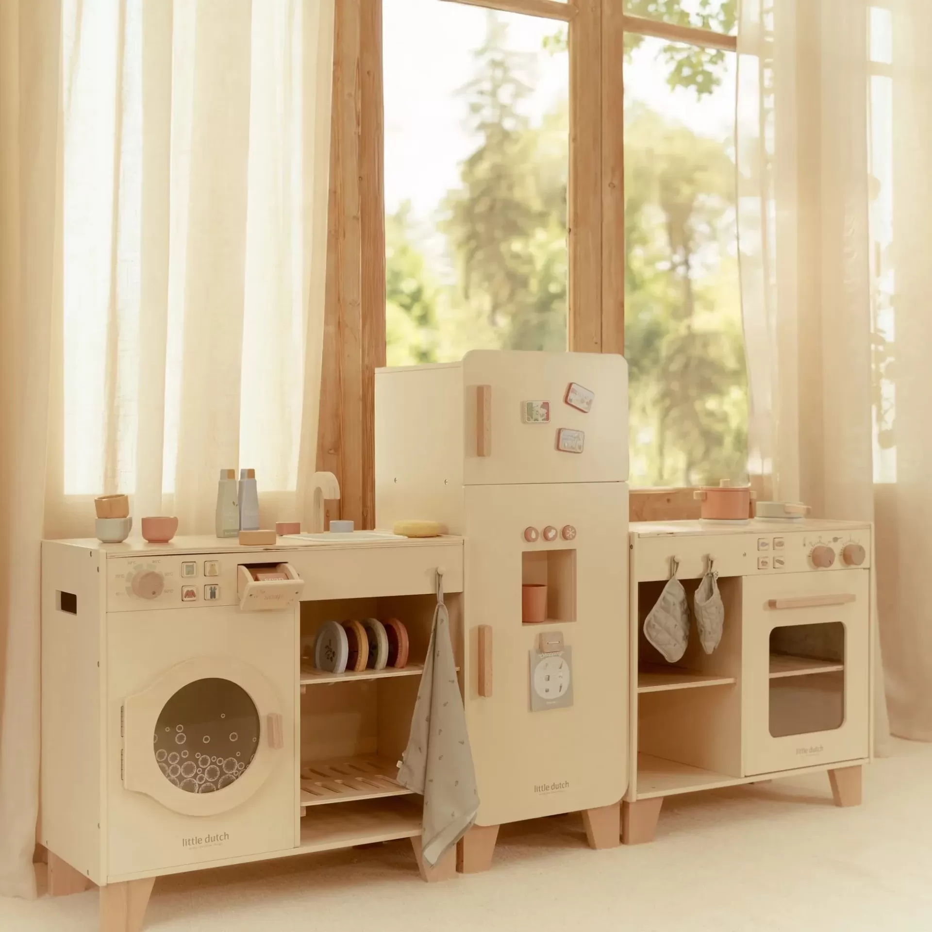 Combinável com os restantes módulos da cozinha Little Dutch: forno, máquina de lavar e lavatório (vendidos separadamente). Um brinquedo de qualidade feito em madeira FSC, pensado para durar.