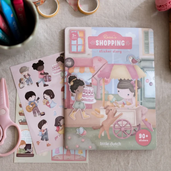 O Livro de Autocolantes Rosa & Friends – Shopping da Little Dutch é perfeito para crianças que adoram criar histórias do dia a dia. Com autocolantes reutilizáveis e cenários ilustrados, permite montar e reinventar cenas de compras, passeios e encontros entre amigos.