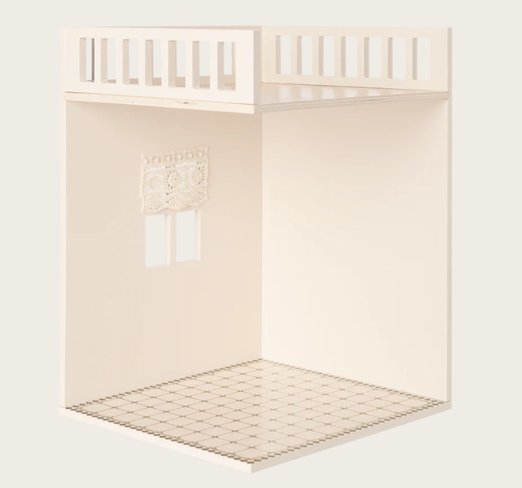 Pensado para integrar perfeitamente na House of Miniature Maileg, este módulo expande a casa verticalmente, permitindo criar uma moradia mais completa e cheia de personalidade. Ideal para estimular a criatividade, a narrativa e a recriação de rotinas do dia a dia.