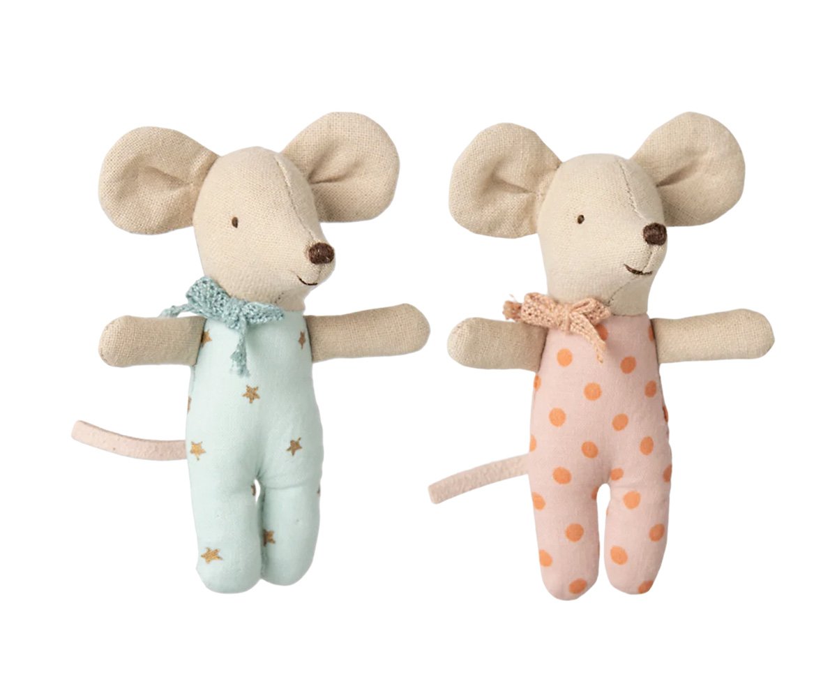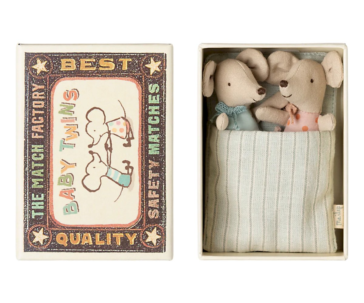 Os Baby Twins da Maileg são pura ternura em dose dupla! A irmãzinha e o irmãozinho vêm aconchegados numa charmosa caixinha de fósforos, com pijaminhas amorosos e detalhes feitos com todo o cuidado e magia que a marca dinamarquesa Maileg nos habituou. Estes ratinhos bebés são ideais para brincar, estimular o faz-de-conta ou simplesmente decorar o quarto dos mais pequenos com um toque poético e encantador.