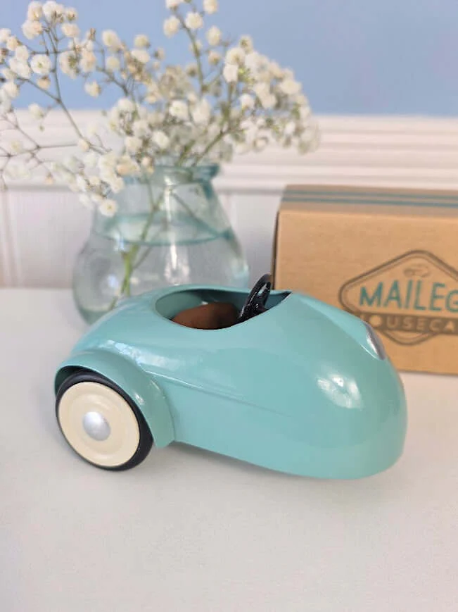 Este carro retro azul claro da Maileg é o meio de transporte perfeito para os ratinhos da coleção. Compatível com os tamanhos Little Brother, Little Sister, Big Brother, Big Sister e até Mum & Dad, este carro em metal é ideal para aventuras criativas e imaginativas. Vem com uma corda para que a criança possa puxar o carro e brincar livremente. Um brinquedo cheio de charme, resistente e cheio de nostalgia, perfeito para oferecer ou colecionar.