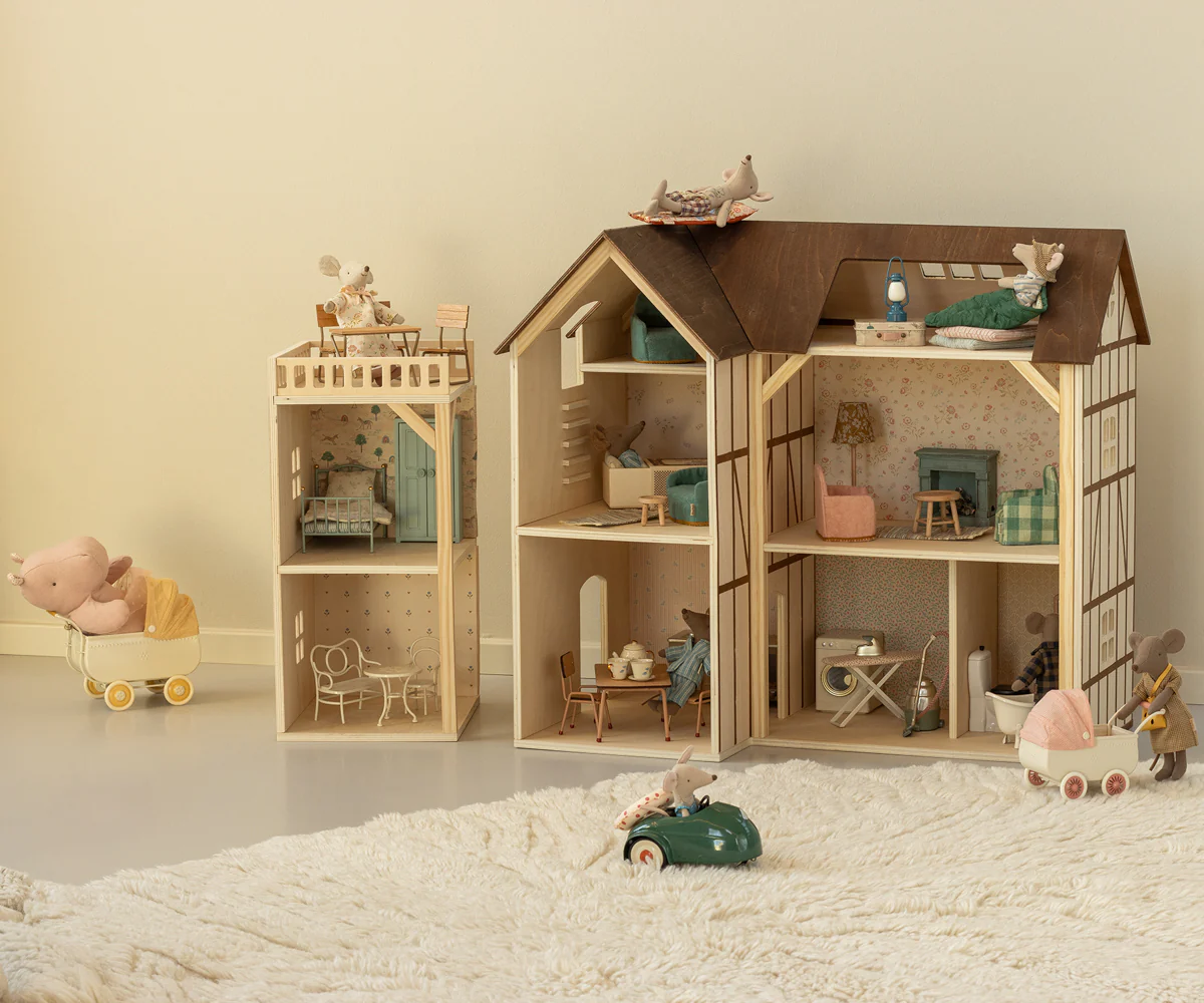 A Mouse Hole Farmhouse da Maileg é a casa de bonecas perfeita para dar asas à imaginação das crianças a partir dos 3 anos. Feita em madeira com detalhes encantadores, esta casa oferece espaço para decorar e brincar com os famosos ratinhos da Maileg (vendidos separadamente). Com divisões amplas e possibilidade de expansão com a bonus room, é ideal para criar histórias, desenvolver a motricidade fina e promover o jogo simbólico.