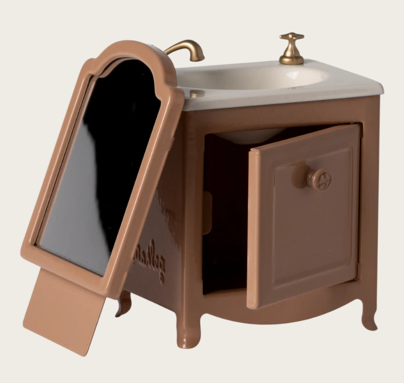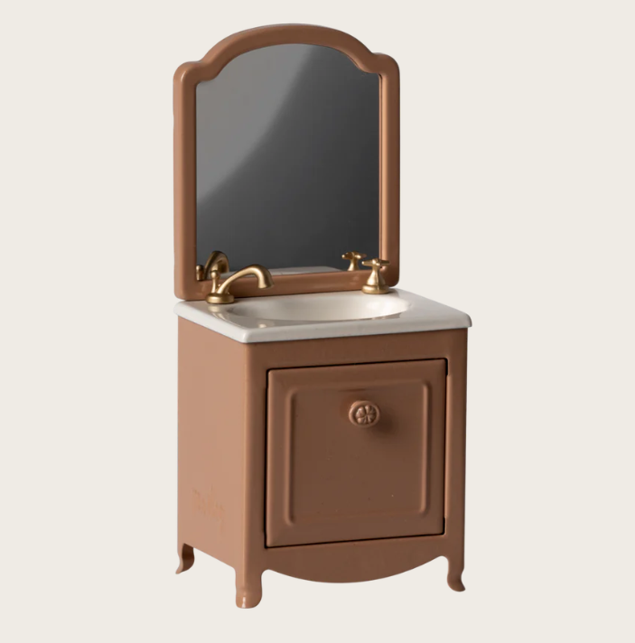 Com um design elegante em tom rosa escuro, esta peça inclui lavatório com torneiras douradas, espelho integrado e armário inferior com porta funcional para arrumação. Os acabamentos delicados e o estilo vintage refletem a estética intemporal característica da Maileg.