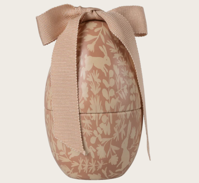 Com um delicado padrão floral e silhuetas inspiradas na natureza, este ovo metálico em tom rosa pastel destaca-se pelo seu laço em tecido, que acrescenta um toque elegante e sofisticado. Fiel ao universo mágico da Maileg, é uma peça pensada para criar tradição, memórias e ambientes cheios de ternura.