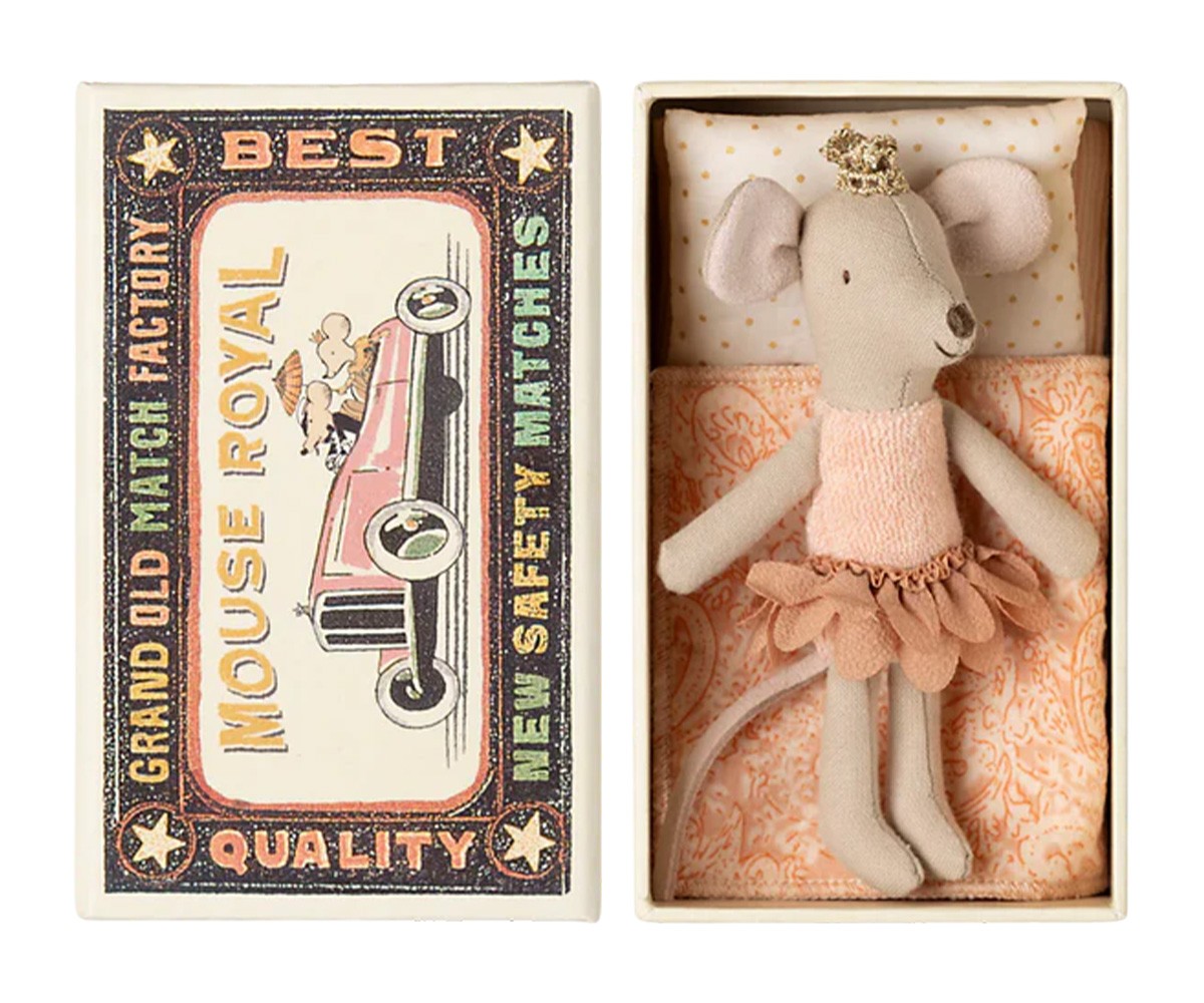 A Princesa Ratinha – Irmã Mais Nova em Caixa de Fósforos é um dos artigos mais icónicos da Maileg, pensado para encantar crianças e colecionadores. Este pequeno rato-princesa está sempre pronto para horas de brincadeira imaginativa e, no final do dia, dorme confortavelmente na sua adorável caixa de fósforos, que funciona como caminha.