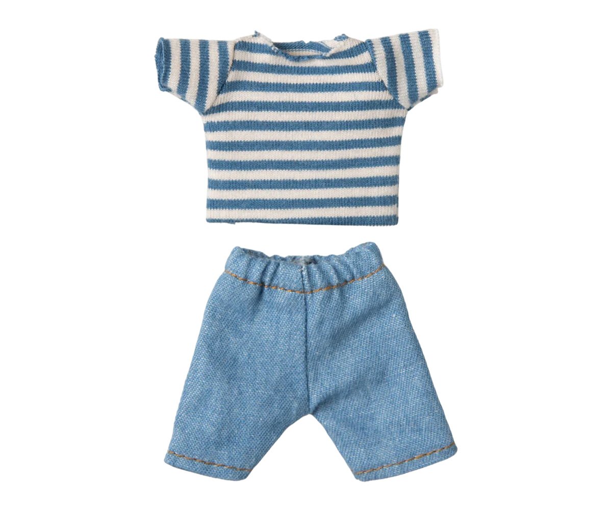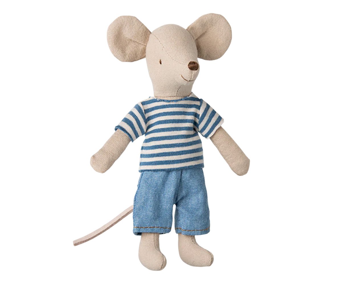 O Ratinho Irmão Mais Velho Louimax da Maileg é a nova adição encantadora para qualquer coleção de brinquedos ou casa de bonecas. Com a sua camisola às riscas azul e calças de ganga, este ratinho está pronto para aventuras mágicas! Os ímanes nas suas mãos permitem-lhe segurar objetos metálicos ou brincar com acessórios Maileg compatíveis, como o trotinete.