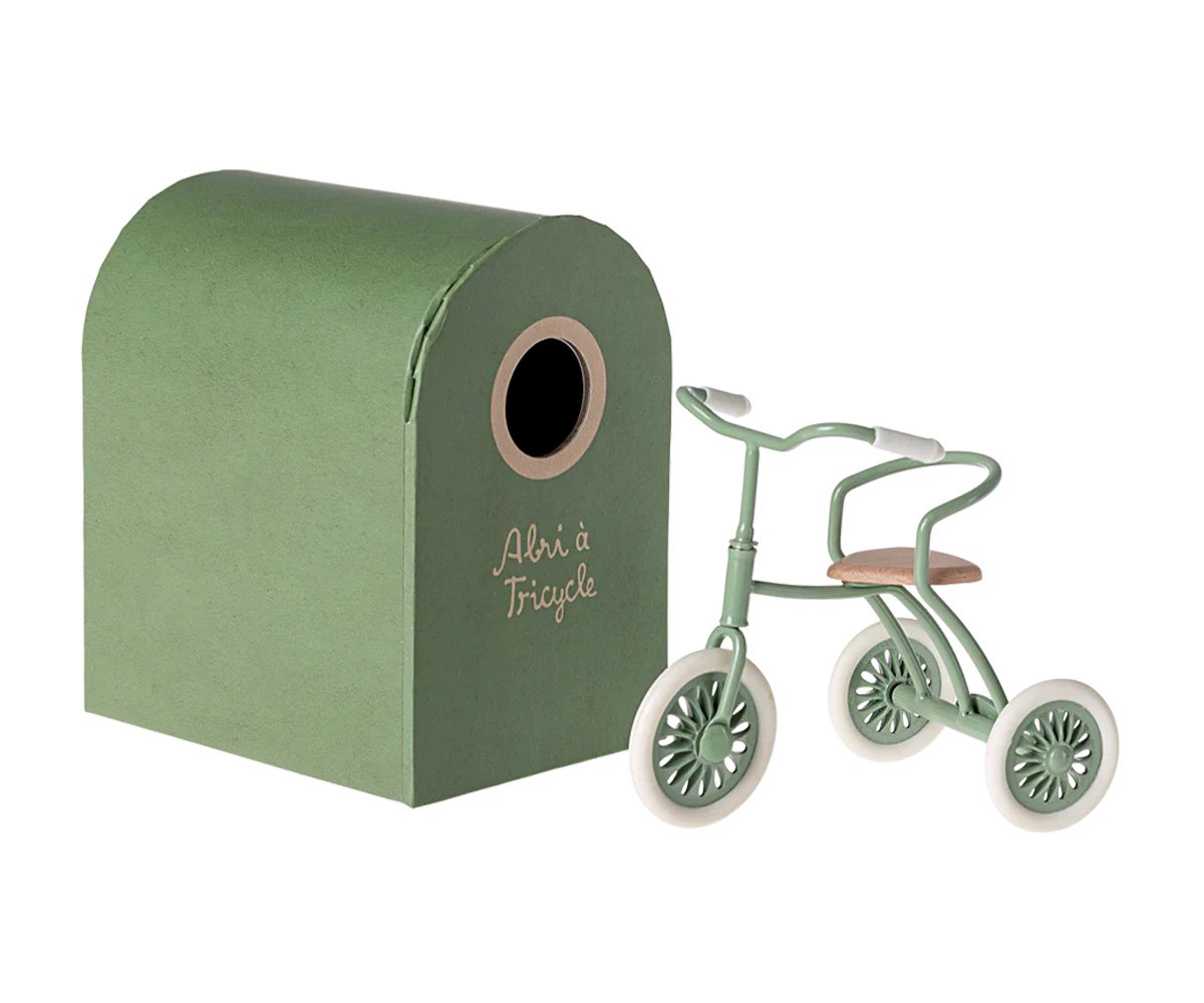 Inclui triciclo verde e garagem de cartão Compatível com ratinhos Maileg irmão e irmã mais velhos Detalhes encantadores e vintage Dimensões aproximadas: 9 x 7 cm Material: metal e madeira A partir dos 3 anos