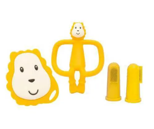 1 mordedor leão em silicone, fácil de agarrar e com textura suave; 1 mordedor plano com forma de cabeça de leão, ideal para bebés pequenos; 2 escovas de dentes de dedo em silicone, para promover uma higiene oral segura desde cedo. Fabricado com tecnologia antimicrobiana e materiais seguros para bebés, este conjunto é indicado a partir dos 3 meses. Além de funcional, é uma excelente ideia de presente para recém-nascido ou baby shower. A forma divertida da girafa conquista pais e bebés!