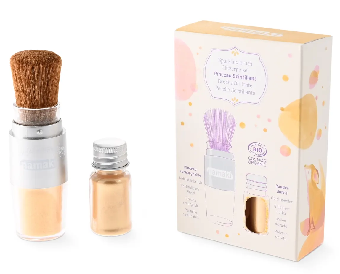 O Pincel Mágico com Pó Glitter Dourado Orgânico da Namaki permite às crianças brilhar da cabeça aos pés enquanto exploram a imaginação de forma segura e consciente. Desenvolvido com pó glitter dourado certificado orgânico, este produto é uma alternativa saudável aos glitters sintéticos tradicionais.