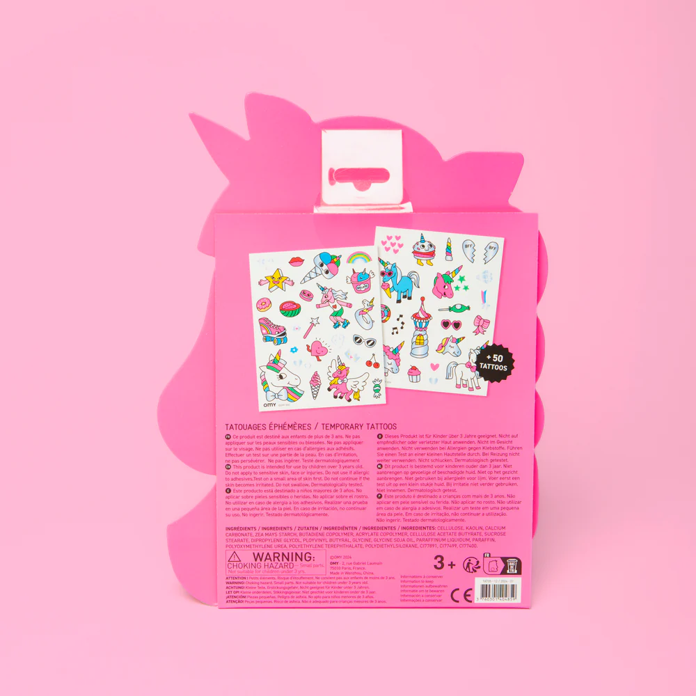 Descobre o mundo mágico da Lily, o unicórnio mais adorável da OMY! Este conjunto inclui 50 tatuagens temporárias com detalhes neon e dourados, perfeitas para crianças a partir dos 3 anos. Com unicórnios encantados, arco-íris cintilantes, estrelas e corações, estas tatuagens são ideais para estimular a criatividade e a brincadeira imaginativa.
