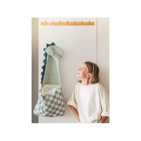 Características: 2 em 1: organizador de parede + bolsa de transporte Design divertido de dinossauro com padrão xadrez verde Fecha com fecho de cordão Material: 100% algodão Dimensões: aprox. 47 x 50 cm Lavável à mão Ideal para brinquedos, roupa ou acessórios Pode ser pendurado ou levado para todo o lado