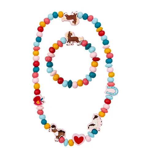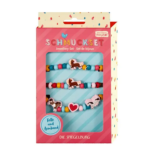 Um presente encantador para os pequenos fãs de cavalos! O Conjunto de Bijuteria Mein kleiner Ponyhof da Spiegelburg inclui um colar elástico e uma pulseira, ambos decorados com contas de madeira coloridas em formas alegres e temáticas.