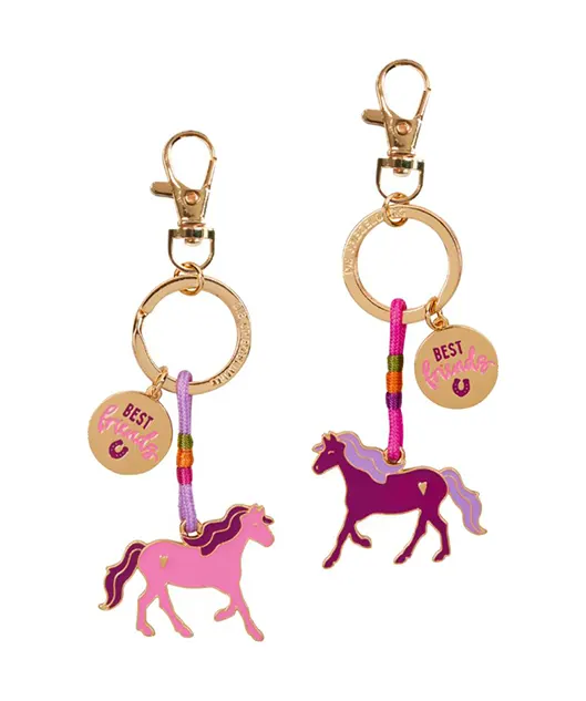 Inclui dois pendentes em metal esmaltado, com ilustrações diferentes de cavalos, cada um preso a uma argola e um mosquetão colorido com cordão em poliéster. Ideal para pendurar em mochilas, estojos, chaves ou lancheiras — sempre com a mensagem “Best Friends” bem visível!