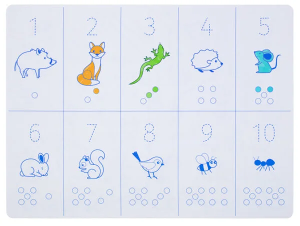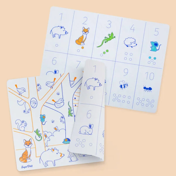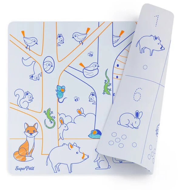 Descubra o Individual Educativo Reversível Super Petit em silicone, a solução perfeita para aprender os números de forma divertida e sustentável! De um lado, um colorido cenário da floresta. Do outro, traçados pontilhados com números e animais para reforçar a prática da escrita.