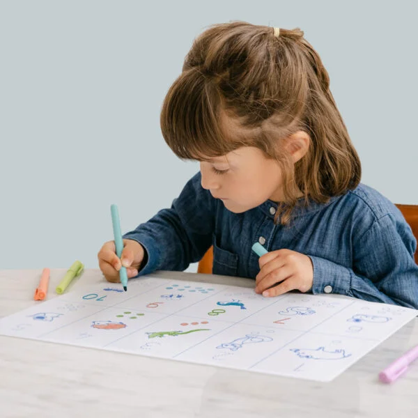 Inclui 3 marcadores apagáveis em cores vibrantes (laranja, verde lima e azul), cujas pontas de feltro deslizam suavemente sobre o silicone e apagam-se com um pano húmido, permitindo infinitas reutilizações.