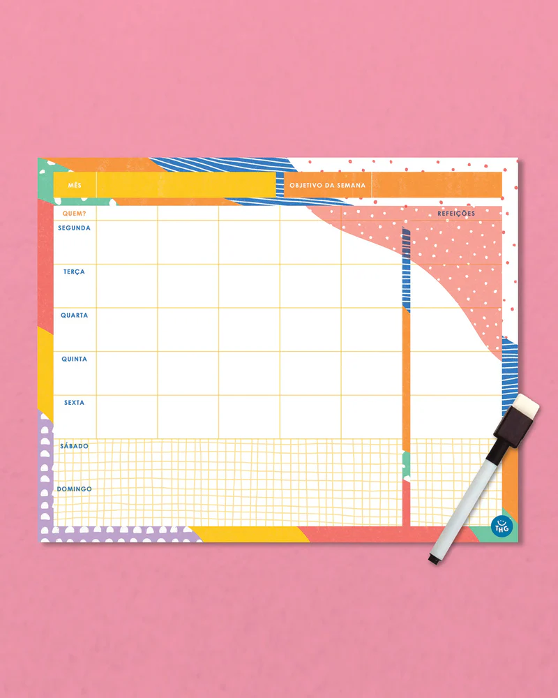 Com um design colorido e alegre, este quadro permite escrever e apagar com facilidade graças à sua superfície reutilizável. Inclui espaço para escrever o mês, as tarefas de cada membro da família, os objetivos da semana e até planear as refeições diárias!
