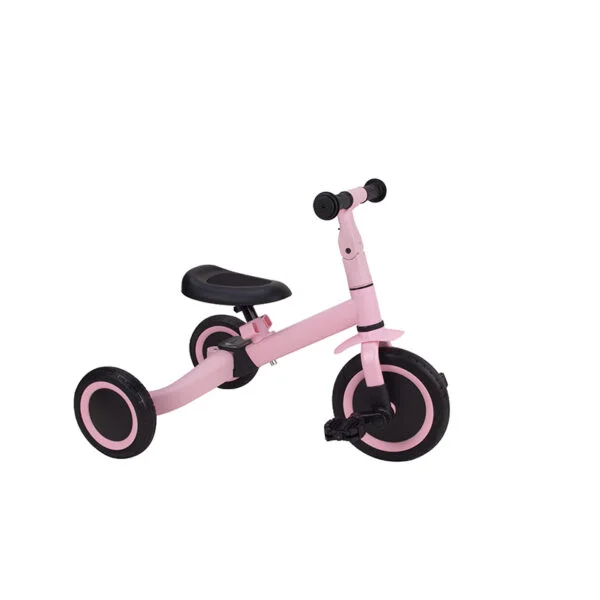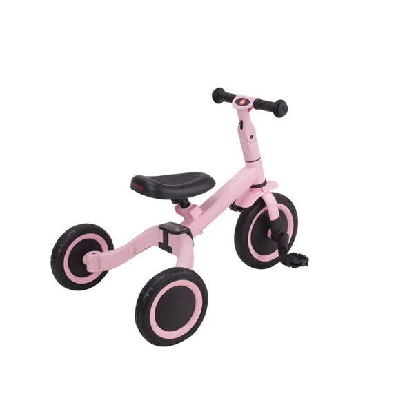 Transforma-se facilmente de triciclo em bicicleta de equilíbrio, bastando recolher as duas rodas traseiras para o centro. Quando a criança estiver pronta, os pedais podem ser instalados com facilidade e guardados de forma prática no quadro, por baixo do selim.