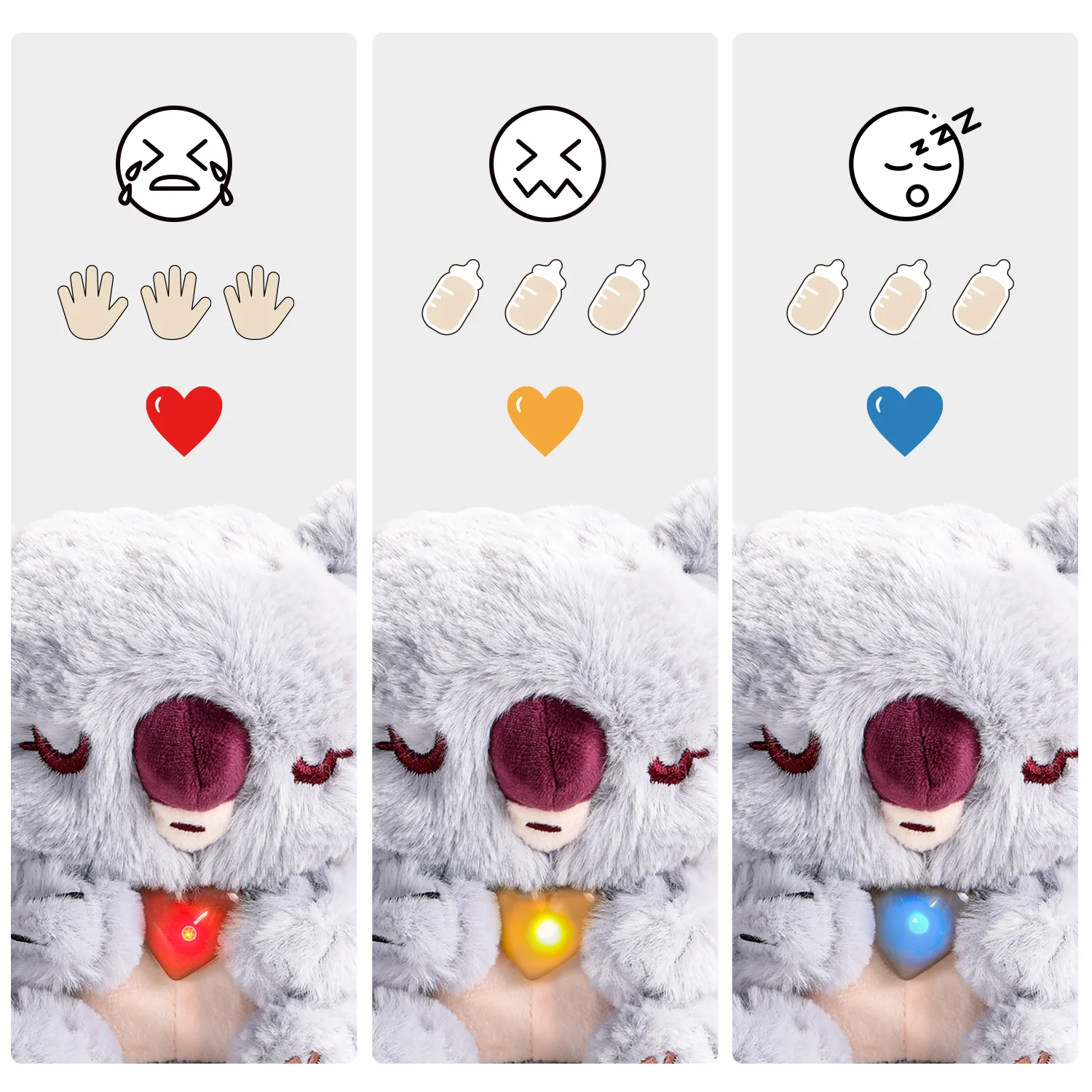 A sua barriguinha brilha com diferentes cores que ajudam a criança a perceber se o Koala está com fome, cansado ou precisa de mimo. As crianças podem alimentá-lo com o biberão ou a colher, escová-lo e até acalmá-lo com carinho. Um brinquedo ideal para desenvolver empatia, responsabilidade e promover o jogo simbólico.
