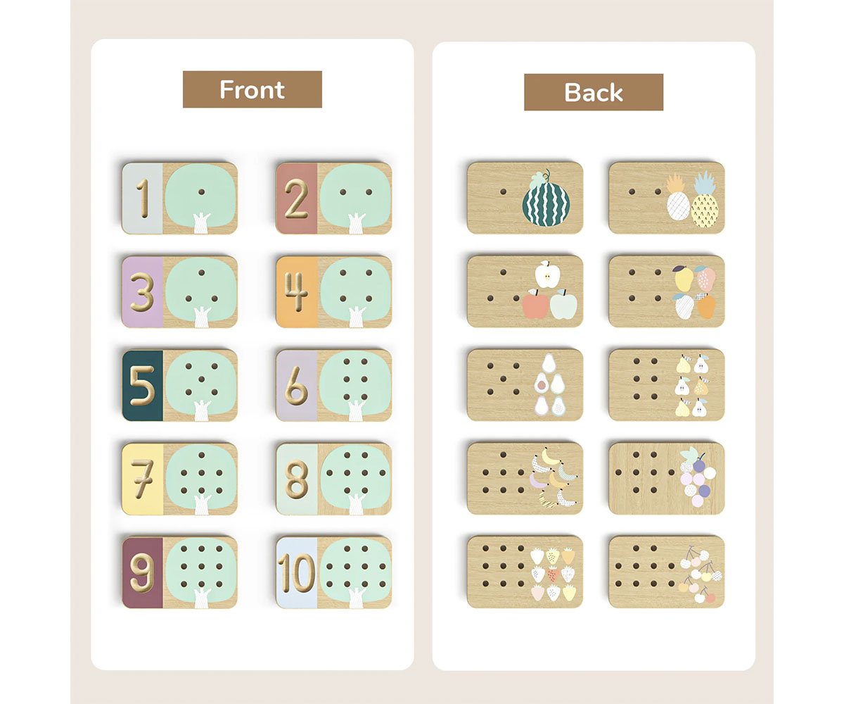 Além disso, o verso de cada placa tem ilustrações de frutas diferentes, permitindo que os pequenos explorem a diversidade alimentar enquanto treinam a contagem. Com o lápis de madeira incluído, as crianças podem também seguir o contorno dos números, desenvolvendo habilidades de escrita, motricidade fina e reconhecimento numérico.