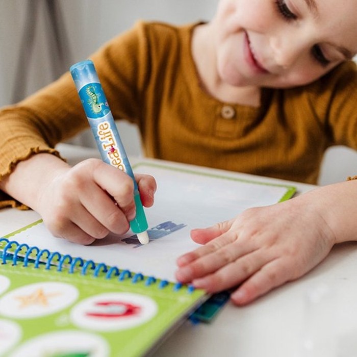 1 caneta mágica recarregável com água Livro com várias páginas ilustradas reutilizáveis Tema: vida marinha (Sea Life) Recomendado a partir dos 3 anos