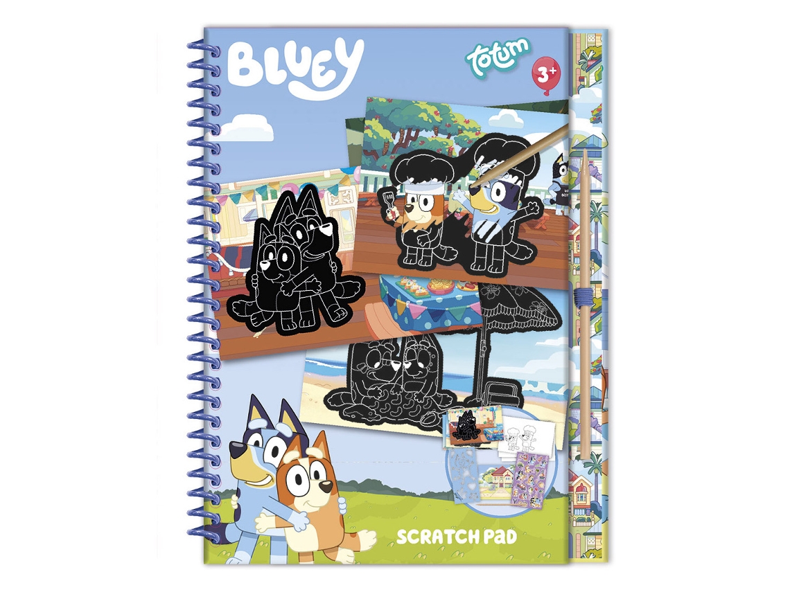 Indicado a partir dos 3 anos Com páginas para raspar e colorir Inclui autocolantes e caneta de raspagem Estimula a criatividade e coordenação motora Tema oficial da Bluey