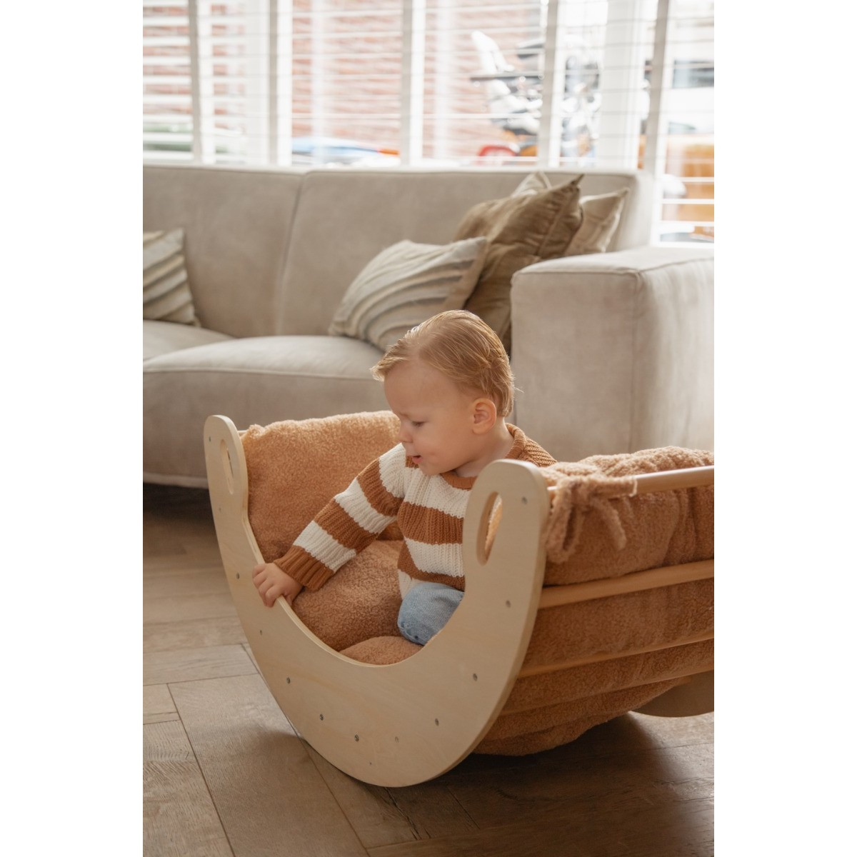 Transforma o arco de madeira Tryco num espaço ainda mais acolhedor e confortável com este suave colchão/almofada. Feito com tecido macio e enchimento fofo, oferece apoio extra para momentos relaxantes, seja a baloiçar ou a descansar. Pode ser facilmente preso ao arco com os laços integrados, garantindo segurança e estabilidade. Ideal para tornar a brincadeira ainda mais confortável!