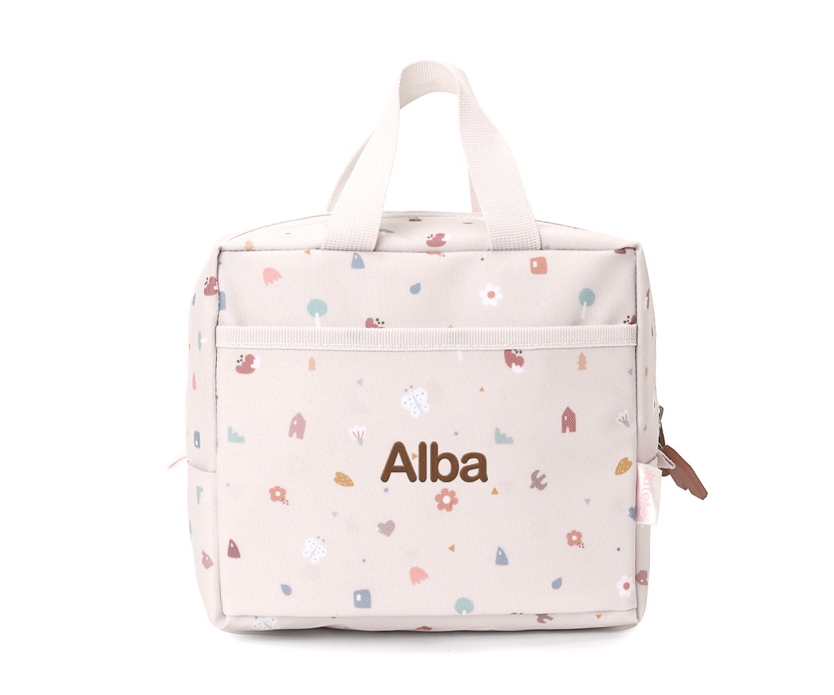 Design exclusivo Tutete com estampado Geometric Nature Interior térmico isolado Tecido impermeável Alça para transporte fácil Bolso exterior Fecho zip com puxador decorativo Compatível com personalização de nome Dimensões aproximadas: 22 x 20 x 10 cm Composição: 100% poliéster reciclado Produto sustentável e durável, ideal para famílias que valorizam qualidade, estilo e consciência ambiental.