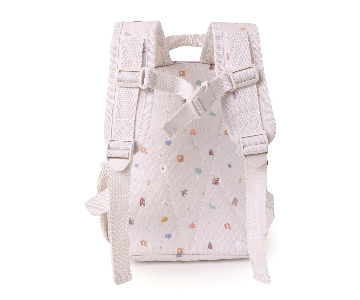 CARACTERÍSTICAS Medidas: altura 28cm x largura 25cm x profundidade 9cm Composição: 100% RPET (plástico reciclado) Fecho de clipe no peito Bolso externo com fecho largura 20cm x altura 12cm Design Ergonómico Alças almofadadas ajustáveis e costas acolchoadas que distribuem o peso sem sobrecarregar os ombros da criança. Capacidade Ideal Dois compartimentos principais espaçosos, bolso frontal com fecho e bolsos laterais em rede para garrafas ou pequenos objetos. Material Resistente Poliéster de alta densidade, impermeável e fácil de limpar, perfeito para o uso diário na escola. Personalização Total Leve e Compacta Pesando menos de 300 g, cabe confortavelmente em qualquer porta-mochila de carrinho ou nas costas de crianças de 3 a 6 anos.